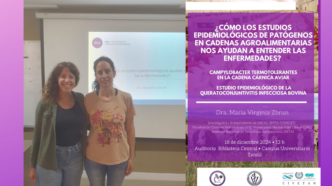 La utilización de herramientas epidemiológicas para la evaluación de peligros presentes en cadenas agroalimentarias con impacto en salud pública y animal nos permite contribuir al conocimiento de la epidemiología de los mismos. Bajo este enfoque, el estudio de Campylobacter termotolerante en la cadena cárnica aviar sumado a otros patógenos e indicadores de resistencia a los antimicrobianos ha permitido generar información local la cual es utilizada para desarrollar estrategias de mitigación. Por otro lado, el estudio epidemiológico de la Queratoconjuntivitis Infecciosa Bovina en nuestros sistemas, también bajo este enfoque, nos ha permitido repensar esta enfermedad, su tratamiento y su prevención. La generación de conocimiento científico es fundamental para diseñar e instrumentar estrategias dirigidas a reducir la prevalencia y difusión de los patógenos a lo largo de las cadenas agroalimentarias. Seguidamente disertó sobre el estudio de Campylobacter termotolerante en la cadena cárnica aviar que mediante muestreos en diferentes etapas de la producción permitan desarrollar estrategias de mitigación.