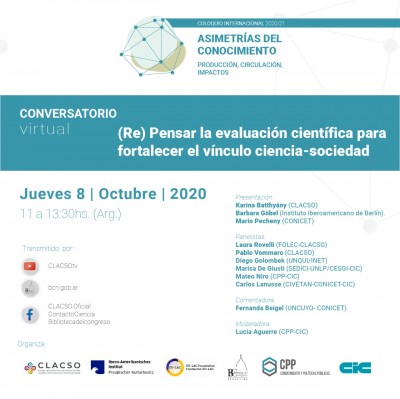 El próximo 8 de octubre a partir de las 11 hs. se realizará un Conversatorio Virtual que será retransmitido por el FB de CLACSO, además de la Biblioteca del Congreso de la Nación y de Contacto Ciencia. El evento contará con los siguientes panelistas: