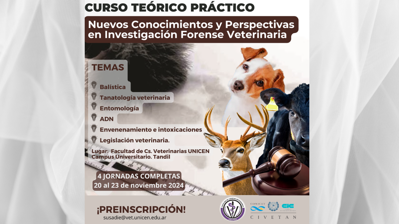 Del 20 al 23 de noviembre el Laboratorio de Toxicología de la FCV e investigadores del CIVETAN realizarán un Curso Teórico Práctico de Posgrado sobre “Conocimientos y Perspectivas en Investigación Forense Veterinaria” El curso está dirigido a veterinarios, abogados, fiscales, peritos forenses y personal de las fuerzas vinculado a actividades forenses. La inscripción se encuentra abierta hasta el 10 de noviembre.