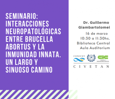 El lunes 16 de marzo a las 10:30 hs se desarrollará un seminario sobre: Interacciones neuropatológicas entre Brucella abortus y la inmunidad innata en el Auditorium de la Biblioteca Central. El seminario será dictado por el Dr. Guillermo Giambartolomei, Investigador Principal del CONICET y Profesor de Inmunología de la Facultad de Medicina de la Universidad de Buenos Aires (UBA).